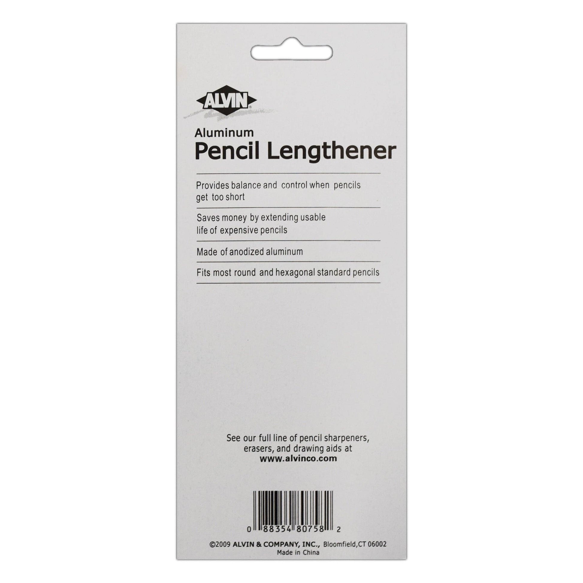 This handy tool provides balance and control when pencils get too short, saving money by extending the usable life of expensive pencils. Fits most round and hexagonal standard pencils. Made of anodized aluminum. Available in a blister-carded pack of three, assorted colors, no choice.