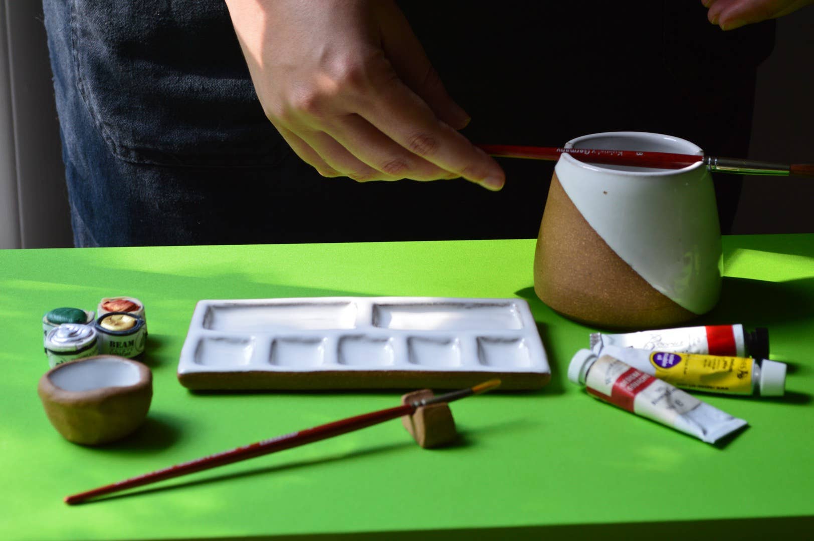 A thoughtful, plastic-free present for the painter in your life. Each palette set is sculpted by our hands in regionally sourced clay that has a naturally rich hazelnut brown color which has been fired twice with maximum temperature reaching 2100 Fahrenheit. The glaze on the surface is a glossy white, which makes the palette waterproof, dishwasher & food safe, and the perfect surface for mixing colors and washing off with ease.