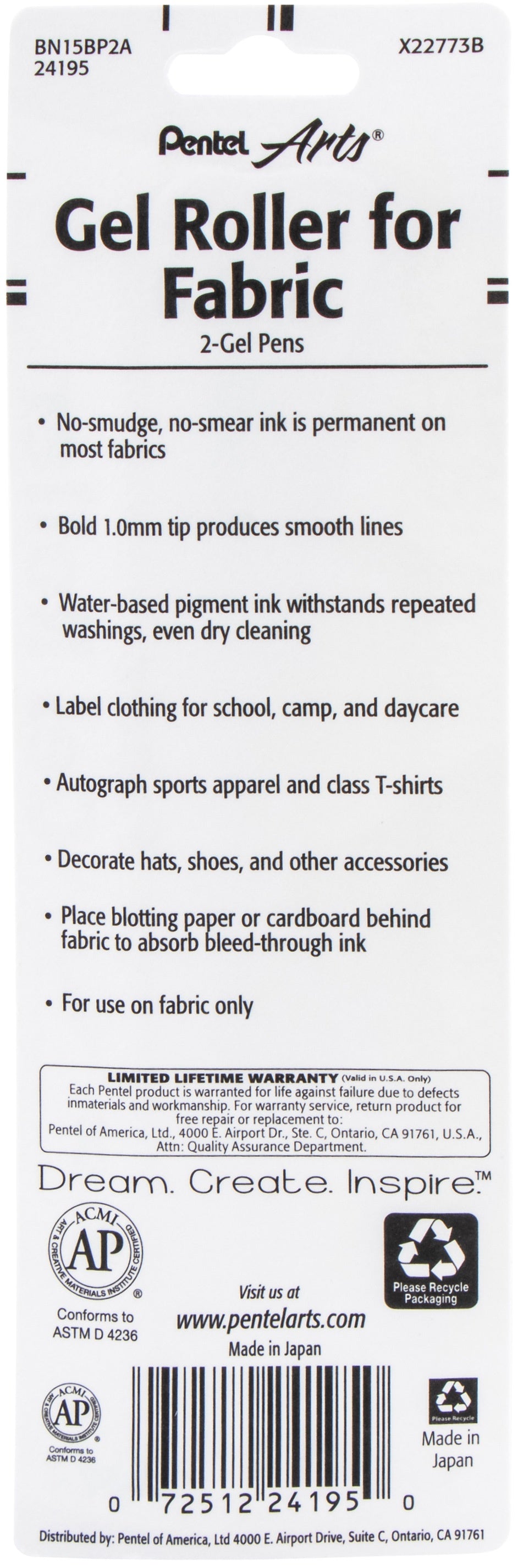 Gel Roller For Fabric. This no-smear, no-smudge ink is permanent on most fabrics. This package contains two black gel rollers with 1mm tips. Acid free. Conforms to ASTM D4236.