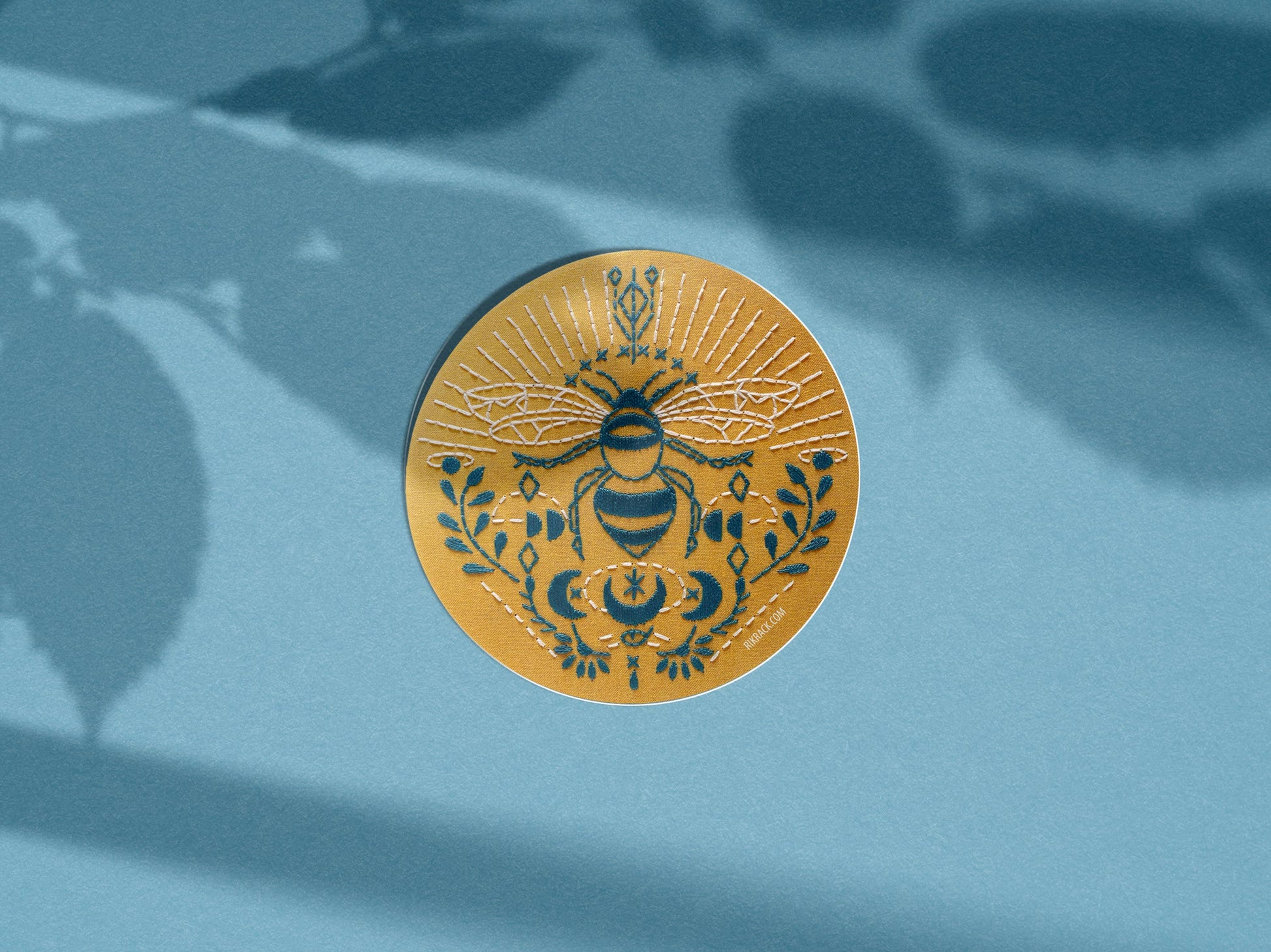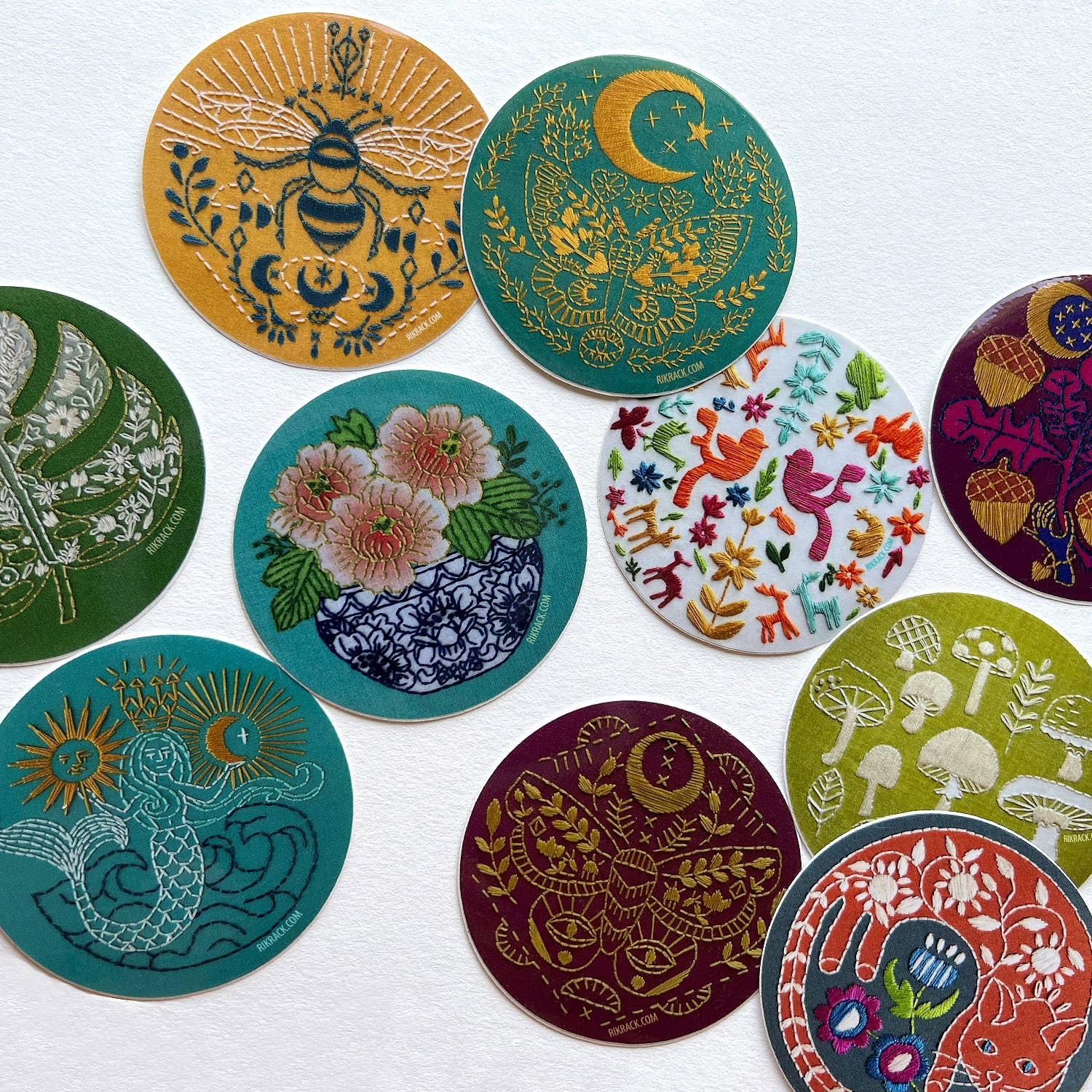 Bee embroidery photo stickers. 3" circle stickers with durable super shiny gloss finish feature beautiful embroidery. Super detailed and colorful. A new spin on traditional sticker graphics. Rikrack embroidery stickers are a great way to show everyone your love of all things crafty. Great addition to Laptops, water bottles, or phone cases.