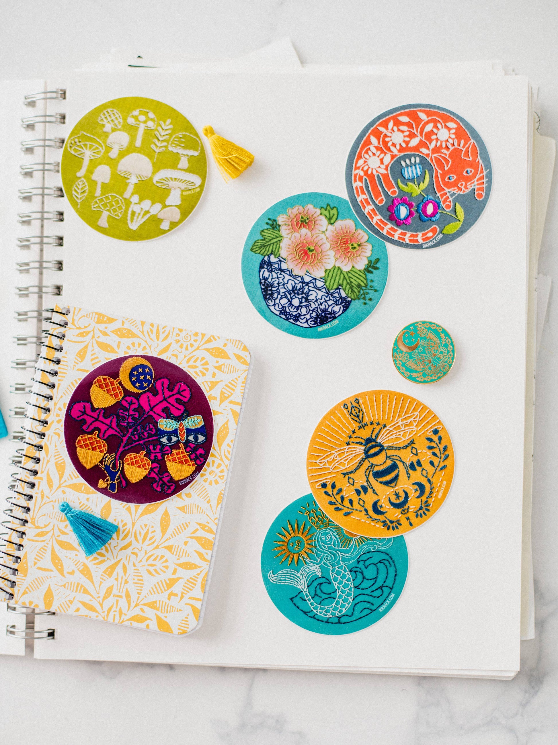 Garden Cat embroidery photo stickers. 3" circle stickers with durable super shiny gloss finish feature beautiful embroidery. Super detailed and colorful. A new spin on traditional sticker graphics. Rikrack embroidery stickers are a great way to show everyone your love of all things crafty. Great addition to Laptops, water bottles, or phone cases.