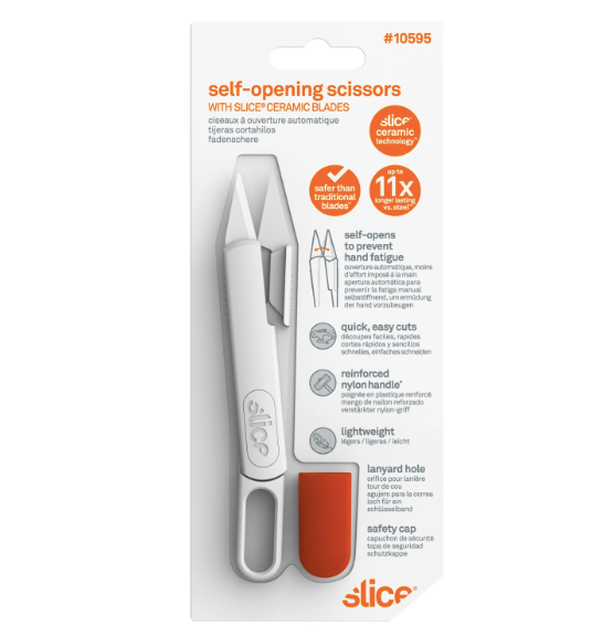 The Slice® 10595 Self-Opening Scissors are ideal for industrial tailors and fibre artists, or anyone with arthritis, hand weakness, or dexterity challenges. This ambidextrous tool’s self-opening design allows the user to squeeze the handle to make a cut, reducing the risk of repetitive strain and lowering overall muscle effort. Made with Slice’s proprietary safety grind, the blades are safe to the touch and and last up to 11 times longer than steel blades. As with all our safety blades, these are oil, lubricant, and maintenance free, and they never rust. Slice’s sleek thread snips feature a safety cap to keep them closed when not in use and a lanyard hole to keep them close by.