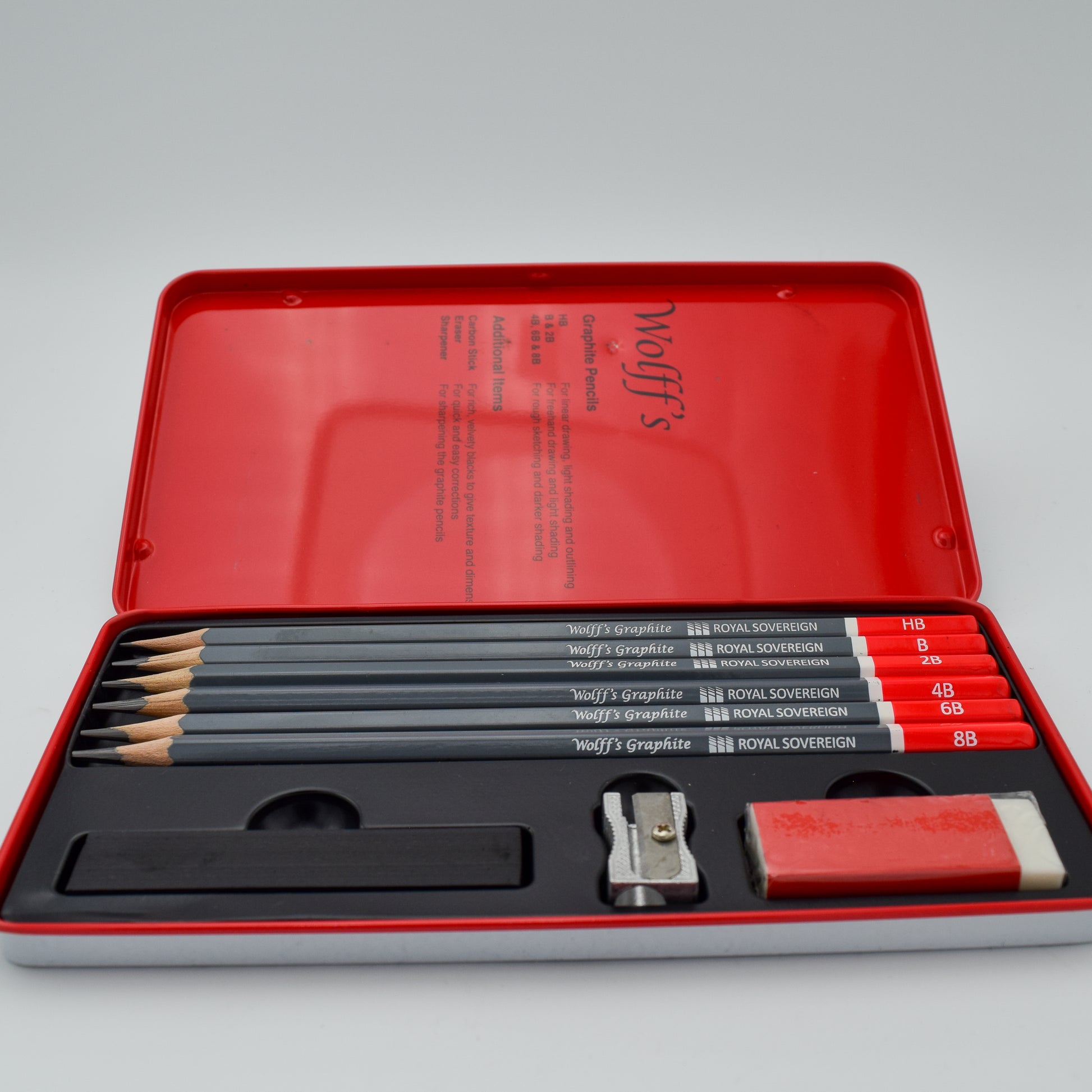 - Wolff's Graphite Sketch Pencil Set, (HB, B, 2B, 4B, 6B and 8B pencils) soft eraser, metal pencil sharpener, & carbon stick) all in a metal tin