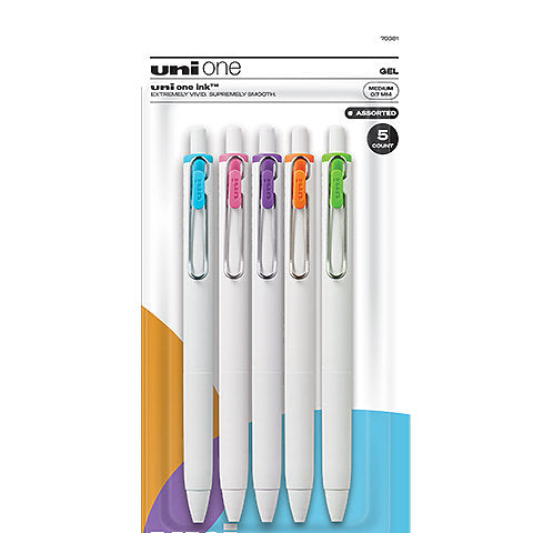 Experience the next stage of ink technology innovation with uni-ball one Retractable Gel Pens from uni-ball featuring a .7mm medium point. The revolutionary gel ink is specially formulated with large pigments that do not absorb into the paper. This results in writing and drawing that is darker, brighter and ultra vivid. Quick drying gel pens resist smudging, smearing and bleeding, making them ideal for crisp and easy to read notes and assignments. A 0.7mm medium tip strikes a balance between bold and detailed lines. The sleek white barrel with integrated anti-slip grip makes this pen a stylish writing tool. Additionally, the functional wire clip indicates the gel ink color, as well as opens wide for easy attachment to papers, notebooks or folders. The uni-ball one gel ink delivers superior writing performance whether at school, at home or at work.