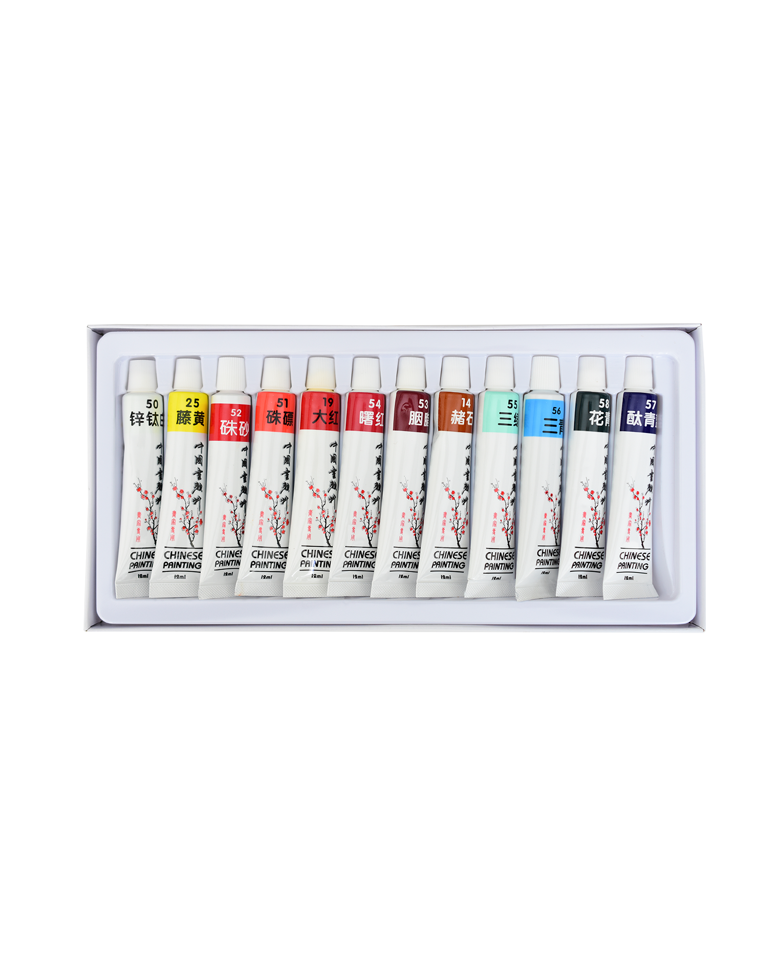 Water-soluble and non-toxic. Offers superior lightfastness. 12-piece set includes 12ml (.04 oz.) tubes of Burnt Sienna, Scarlet, Gamboge, Chinese White, Vermilion, Cinnabar, Rouge, Carmine Red, Light Green, Light Blue, Phthalo Blue and Indigo. Set comes in a box with a hang tab.